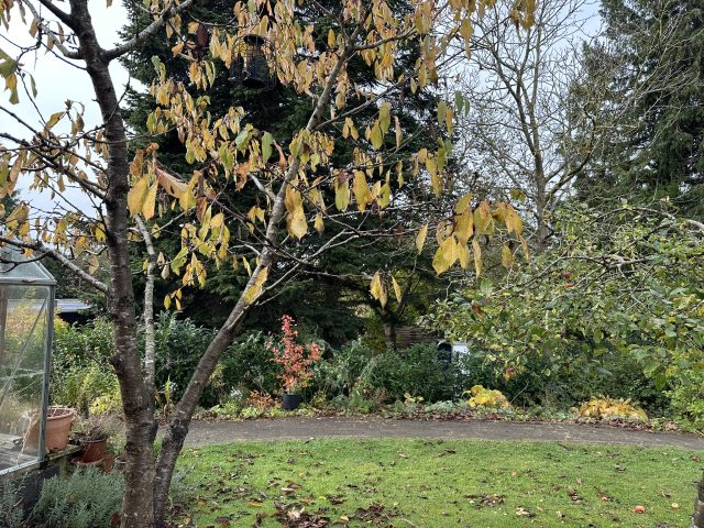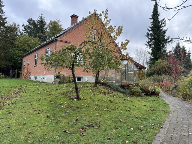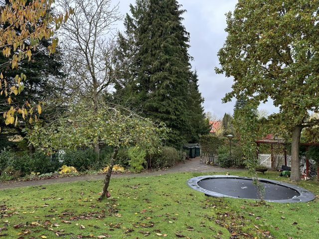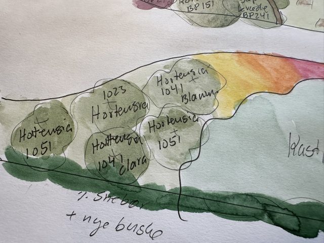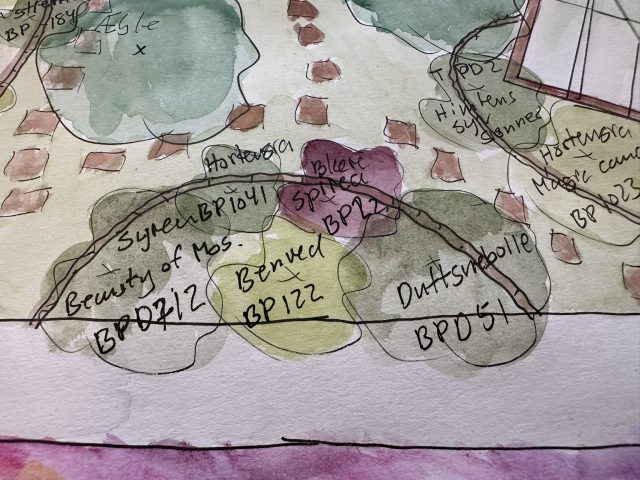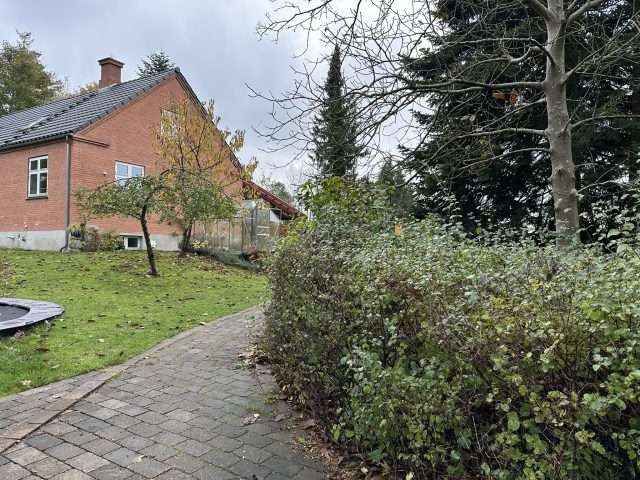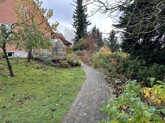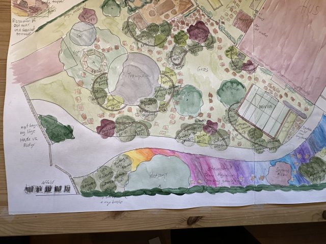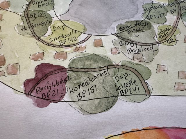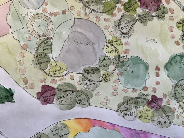 Haveplan villahave Bagsværd, mar 2026, Busketter bryder stiens lange lige linje og skaber rum i haven